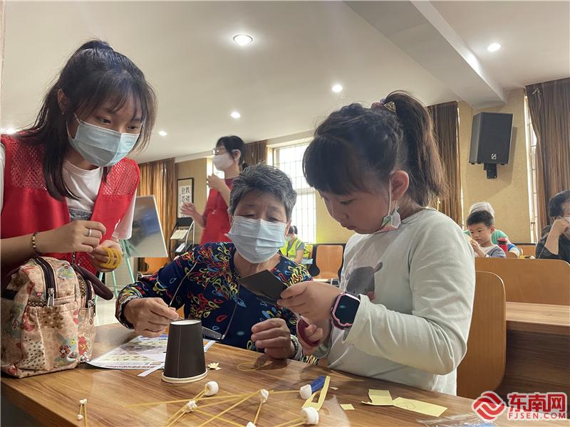 大學(xué)生志愿者指導(dǎo)祖孫二人制作“蹦跳企鵝”(銀江路志愿服務(wù)驛站供圖)