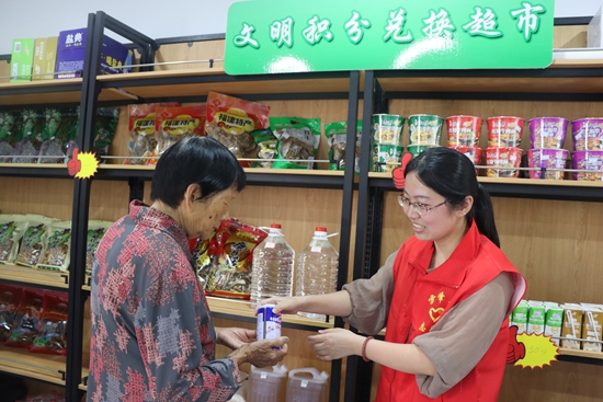 文明風6月8日訊 “現在家里的生活用品基本不用花錢,用‘文明積分’就可以兌換。這次剛好家里沒有油了,我過來換一瓶”。近日,雷峰鎮潘祠村羅阿姨拿著志愿服務積分卡來到潘祠村“文明積分超市”,用平常幫助孤寡老人打掃衛生賺取的120積分兌換了一瓶花生油。