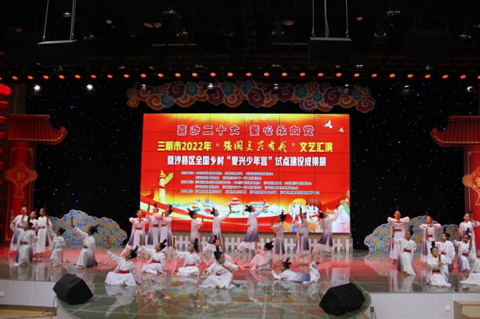 活動最后,還開展了三明市2022年“強國復興有我”文藝匯演,鄉村“復興少年宮”的老師們和孩子們先后表演了大合唱《最好的未來》、散文詩《沙縣小吃的密碼》、肩膀戲表演京劇《沙家浜》選段《智斗》、歌曲《領航新時代》、古箏演奏、舞蹈《壯志少年行》等文藝節目。