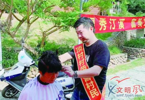 文明風7月8日訊(通訊員 黃文水 余雪燕 林文足)昨日,在廈門同安五顯鎮西洋村的一棟古厝里,穿著紅馬甲的三名理發師一絲不茍地為老人們理發,理完頭發的老人興高采烈出門去,招呼其他老人也過來理發。這是同安典塑美發店進鄉村義剪的一幕。