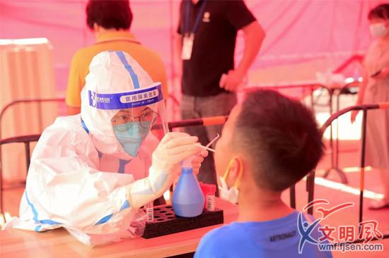 文明風8月15日訊 連日來,在廈門市翔安區核酸檢測點,醫護人員、社區工作者、黨員干部、志愿者冒著高溫,一絲不茍地為居民開展核酸檢測,天使白、志愿紅、守護藍,匯聚出了一道道讓群眾安心的抗疫“彩虹”。