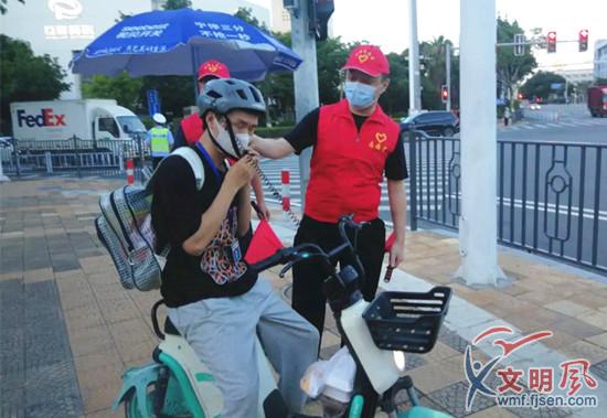文明風8月30日訊 “等紅燈不能越線,頭盔的卡扣要系好?!薄艾F在是紅燈,您還不可以過馬路,請再等一等!”最近,在廈門翔安街頭,每逢早晚高峰,都會出現一抹亮眼的志愿紅。他們身穿志愿者服裝,手持小紅旗,勸導市民遵守交通規則,引導安全出行。