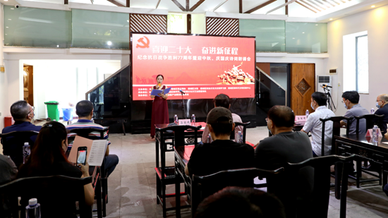據了解,此次活動由中共鯉城區委宣傳部、鯉城區委文明辦、鯉城區文聯、鯉城區政協文化文史和學習委、鯉城區新時代文明實踐中心聯合主辦。參與者均為鯉城區詩詞學會成員,他們圍繞“喜迎二十大,奮進新征程”“紀念抗日戰爭勝利77周年”“迎中秋、慶國慶”等主題開展詩詞創作,并由本人或其他學會成員上臺表演朗誦,回顧紅色歲月,禮贊光輝歷程。