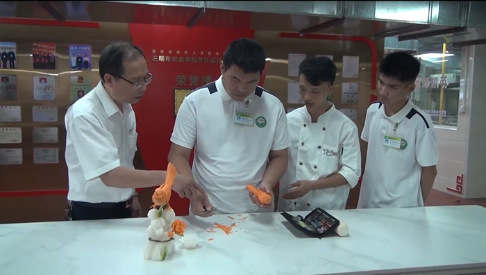 鄭壽兒老師在烹飪課上指導學生雕刻