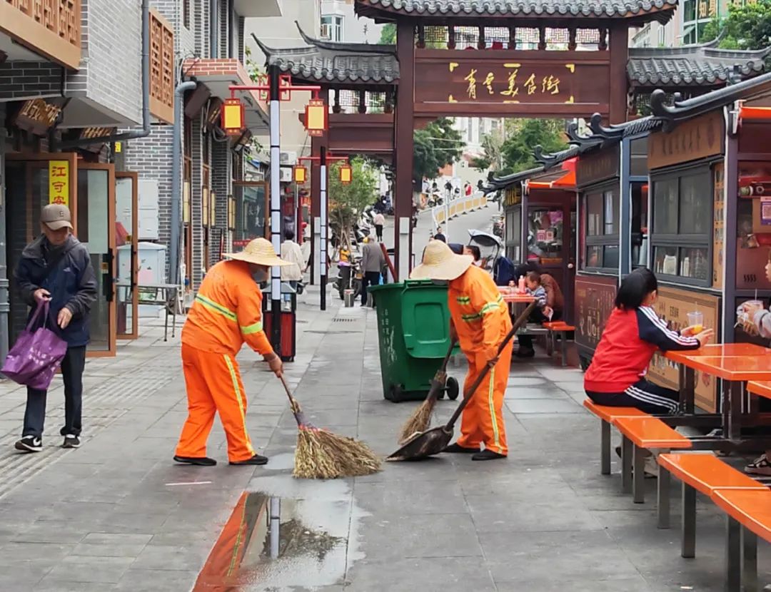 在解放路,環衛工人對道路兩旁的行道樹落葉進行清掃收集;在青云美食街,沖洗車對街道進行精細化清洗......