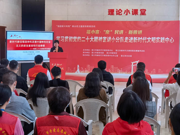 文明風11月11日訊 學習宣傳貫徹黨的二十大精神,是當前和今后一個時期的首要政治任務。為進一步掀起學習黨的二十大精神熱潮,推動習近平新時代中國特色社會主義思想往深里走、往實里走、往心里走,連日來,晉江市充分發揮新時代文明實踐陣地資源作用,組織開展“福小宣?‘泉’民講?新晉講”黨的二十大精神宣講小分隊走進新時代文明實踐中心(所站)系列活動,深入開展宣傳,迅速掀起學習宣傳貫徹黨的二十大精神熱潮。