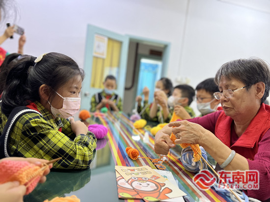 孩子向社區志愿者學習毛線編織。泉州市鯉城區實驗小學供圖