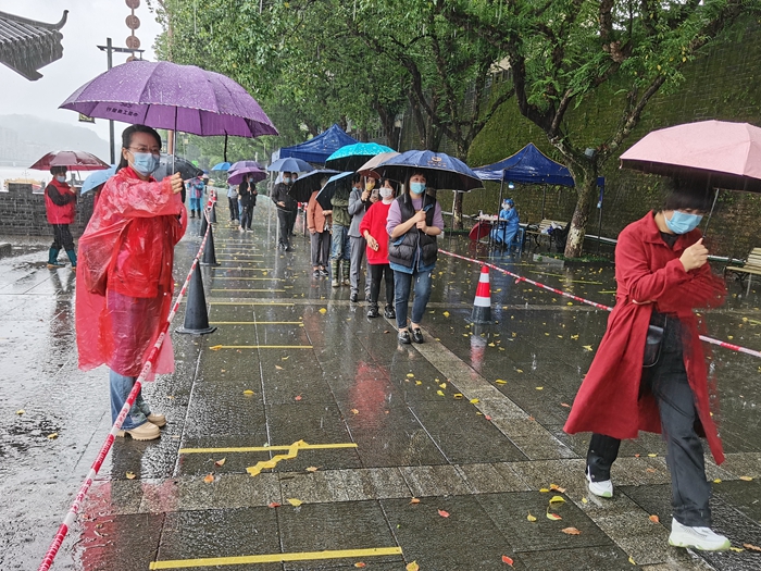 大雨滂沱,依然無法阻擋志愿者們的步伐,6支疫情防控志愿服務隊分布有序,他們是群眾的“講解員”,為中老年群眾不厭其煩地講解健康碼掃碼操作;他們是社區的“疏導員”,配合社區工作者將現場隊伍疏導得井井有條;他們是點位的“快遞員”,穿上雨衣奔波來回搬送耗材,減輕檢測點物資運送壓力。
