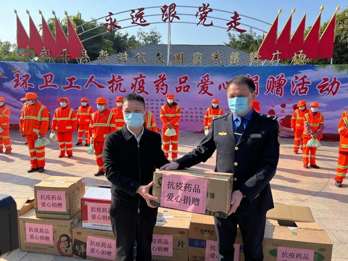 在活動現場,各藥企負責人和工作人員將醫用口罩、感冒清熱軟膠囊、布洛芬、板藍根顆粒、酒精等防疫物資逐一發放到環衛工人手中,叮囑他們在工作中注意安全作業,以健康的身體在平凡崗位上做出更大的貢獻。