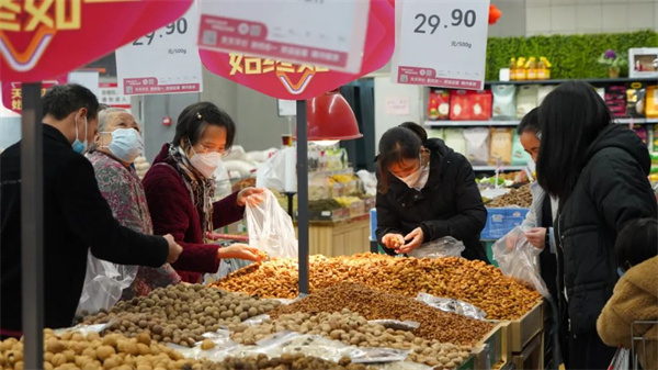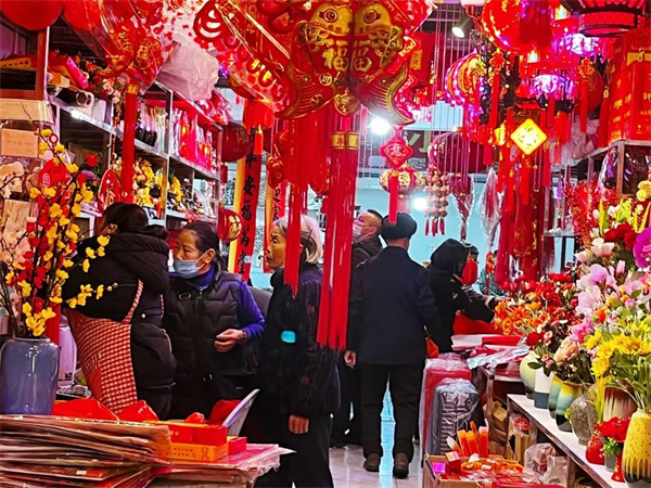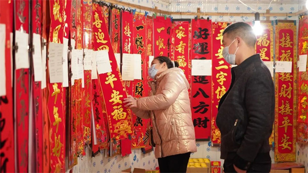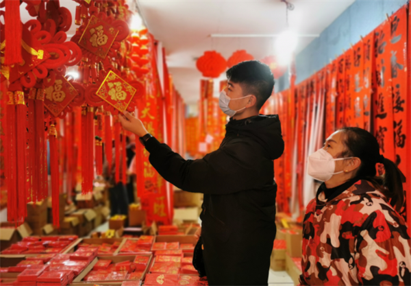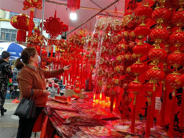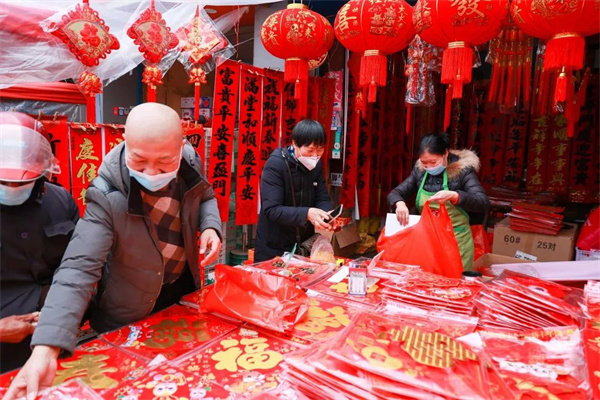 2023年新春進入倒計時階段,將樂街頭巷尾的年味日漸濃郁。商超、年貨市場里,各式各樣的春聯、福字等商品琳瑯滿目,前來選購年貨的人絡繹不絕,市民們忙著選購春節飾品,到處都是喜氣洋洋的景象。