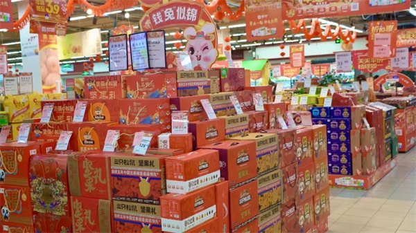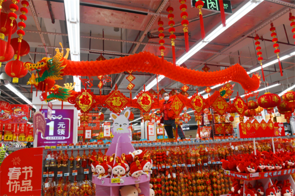 1月12日,在尤溪縣各大商超的醒目位置,都擺上了帶有“福”“兔”“春節”等字樣的對聯、飾品,營造出濃濃的年味。市民也根據需要購置相關物品,扮靚春節。