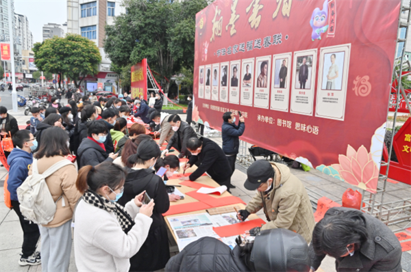 1月11日,沙縣區舉辦“翰墨書春”書法名家送福送春聯活動。活動現場人頭攢動,墨香四溢,大家邊欣賞、邊拍照,手持春聯,笑逐顏開,一幅幅春聯和“福”字送到群眾手上,紅彤彤的春聯映襯得活動現場年味十足。