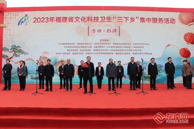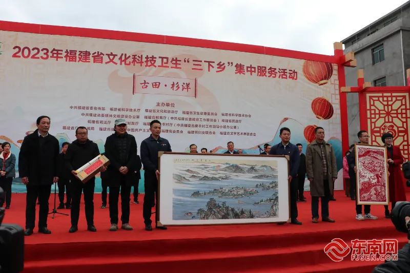 觀浮水畫、版畫、古田麥芽糖制作技藝,賞蒲城剪紙、廈門蔡氏漆線雕非遺文創作品……把戲臺搭進基層,把技術送到田間,把健康送進農家。2月17日上午,全省文化科技衛生“三下鄉”集中服務活動在寧德市古田縣杉洋鎮舉行。省委常委、宣傳部部長張彥出席活動,寧德市委書記梁偉新、省直主聯辦單位有關領導同志等參加活動。