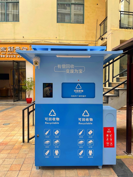 同時,將可回收物藍色垃圾桶升級為智能回收箱,居民可根據回收箱提示進行投遞。箱體上裝有操作中控平臺,為垃圾分類帶來很好的宣傳和引導作用。居民通過正確參與垃圾分類、參與線上問答游戲、參與垃圾分類公益活動等獲取碳積分,碳積分在平臺可兌換生活用品,促使居民完成從“要我分”到“我要分”的思想轉變。