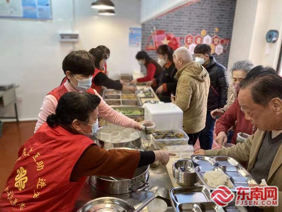 新峰社區“紅色關懷·銀齡互助”志愿服務隊在長者食堂開展志愿服務。鯉城區委老干局 供圖