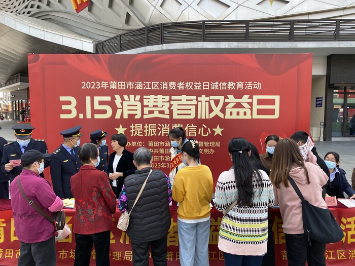 文明風3月17日訊 為切實保護消費者權益,進一步營造誠信經營、安全放心的消費環境,3月15日,涵江區市場監管局、涵江區委文明辦、涵江區消委會聯合區法院、檢察院等15個部門,在涵江水韻城廣場開展以“提振消費信心”為主題的“3?15國際消費者權益日”現場宣傳活動。