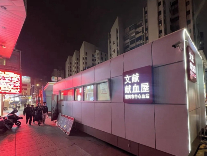 3月18日晚8時許,在商鋪林立、人來人往的莆田市區(qū)文獻東路,一棟灰色小屋靜靜“臥”在大廈前的空地上,“莆田中心血站文獻獻血屋”紅色招牌在夜幕下格外醒目。