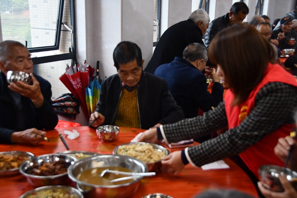 上午10點30分,老人們陸陸續續來到食堂,食堂的工作人員和志愿者們熱情招呼著前來用餐的老人們。米飯隨吃隨添,菜品葷素搭配,營養豐富,老人們吃得津津有味。
