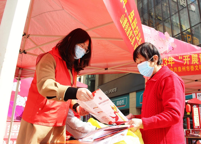 志愿者分發講解《福建省志愿服務條例》(泉港區委文明辦供圖)