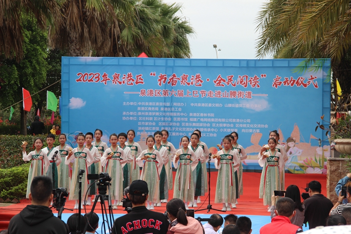 在上巳節傳統文藝演出現場,《南歌子·上巳節三月三》歌曲演唱、《泉港再出發 “八?!弊吣涎蟆沸∑费莩?、《綠色閱讀共護苗》快板表演、《春光明媚》南音舞曲伴舞……形式多樣、內容豐富的文藝節目精彩紛呈,為在場的群眾送來視覺與聽覺的盛宴和豐富的文藝大餐。