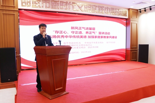 文明風4月28日訊(通訊員 吳利武 圖/文)為深入學習貫徹習近平總書記關于注重家庭家教家風建設的重要論述,弘揚優秀中華傳統美德,建設好家庭、涵養好家教、傳承好家風。4月26日,由南平市政協機關、市委文明辦、市婦聯共同主辦的新風正氣進基層“存正心、守正道、養正氣”暨“弘揚優秀中華傳統美德 加強家庭家教家風建設”巡講活動在邵武市新時代文明實踐大講堂拉開序幕。活動由南平市委宣傳部部務會成員、市委文明辦主任黃益水主持。