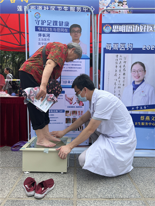 “真皮層的斑,一定要等黃褐斑治好后才能進行激光處理。”活動現場,志愿服務攤位前排隊的人群絡繹不絕,廈門市中醫院醫療美容科主任醫師、南普陀中醫院名譽院長翁麗麗一邊耐心囑咐患者,一邊寫下藥方。當天,活動專設20個志愿服務攤位,邀請了廈門南普陀中醫院、思明區婦幼保健院和思明區各街道社區衛生服務中心的專業醫師和護士為居民進行義診和健康咨詢。醫務工作者們以精湛的醫療技能和貼心的服務態度,提供乙肝篩查、口腔保健、血糖測量、志愿醫療等免費服務,還有嬰幼兒照護指導、中草藥科普、足踝專科門診咨詢、應急救護培訓等專業科普指導,為居民們答疑解惑,傳遞健康知識。