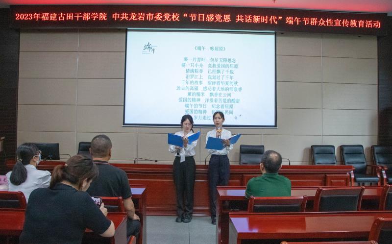6月19日,福建古田干部學院 中共龍巖市委黨校以“弘揚傳統文化,厚植愛國情懷”為主題,舉辦了一場端午詩詞朗誦會。圍繞“話端午、憶屈原、頌祖國”三個環節,用抑揚頓挫、滿懷深情的聲音朗誦了《浣溪沙·端午》《端午 詠屈原》結合《我的祖國》等經典詩詞。(龍巖文明網)
