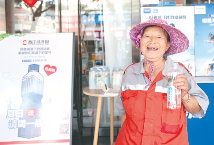 來自四川的環衛工人練德碧,每天都要打掃新華書店到翰林春天之間的路面。正午時分,太陽灼得火熱,自帶的溫水喝完后,練德碧來到新華書店“清涼一站”取用愛心水。看著手中的礦泉水,練德碧不停道謝:“現在天氣這么熱,有時候想喝點涼水,我就可以直接過來拿,很方便。感謝你們!”
