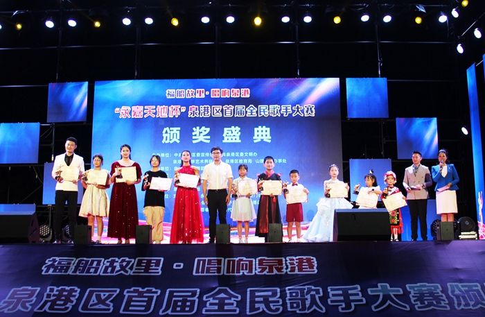 泉港區“福船故里·唱響泉港”永嘉天地杯首屆全民歌手大賽啟動儀式于5月下旬啟動,大賽分為幼兒組、小學低年級組、小學高年級組、初中組、高中組和成年組。本屆大賽共有260多位選手參賽,經過多輪的海選和復賽后,6個組別有118位選手晉級到總決賽。在經過總決賽的角逐后,共產生60位獲獎選手。13日當晚舉行頒獎儀式,為泉港區首屆全民歌手大賽獲獎選手頒獎。