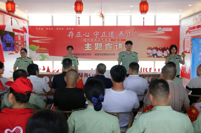 “新風正氣美名傳,福建名片響叮當,好啊!”伴隨著高速公路仙游菜溪服務區傳來的陣陣掌聲,一場由莆田高速“一路幫”宣講團帶來的新風正氣福建“名片”“三句半”節目正在上演。