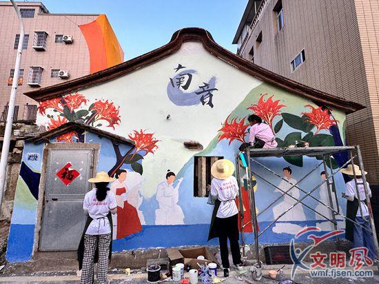 原來,這兩幅創意墻繪出自福州大學廈門工藝美術學院的11名大學生之手。7月22日,這支實踐隊來到社區,開展暑期社會實踐活動。在街道和社區的幫助下,實踐隊經過充分調研和實地走訪,最終確定以文化傳承為主題,立足當地文化特色進行墻繪設計。連日來,大學生們駐扎在社區,用心創作,用他們的畫筆為社區留下寶貴的文化記憶。參與創作的大學生孫淑華說:“很高興能用手中的畫筆為鄉村振興貢獻一份青春力量。”
