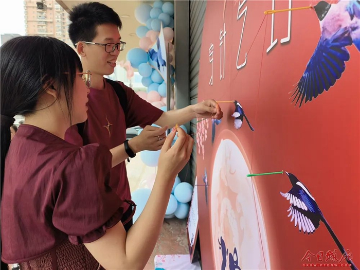 活動現場,主辦方組織社工與20余名志愿者開展婚俗改革、優良家風建設宣傳,為現場新人拍攝甜蜜合影,活動還設有穿針乞巧、情侶手作DIY等環節。在社工與志愿者的引導下,新婚夫妻紛紛“動手”,密切配合,合作無間,不一會,一個個精致的DIY作品誕生,留下最美好的回憶與紀念。