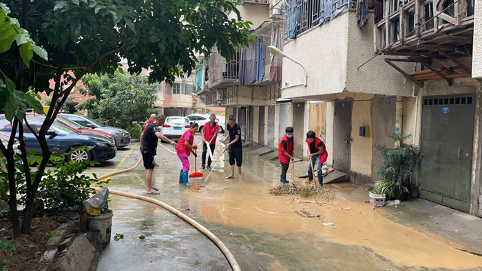 對湖街道組織黨員干部清理路面倒伏的樹木,清掃雨水過后留下的淤泥和樹枝(倉山區對湖街道 供圖)