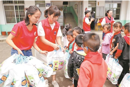 “我喜歡這個粉色文具袋?!薄斑@些零食我要帶回家和爺爺奶奶分享,他們都沒吃過呢……”泉州怡閩酒業有限公司送上的學習用品和零食大禮包讓孩子們開心不已。