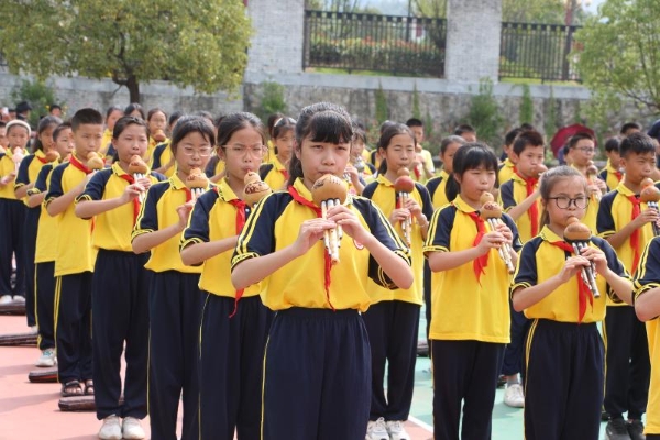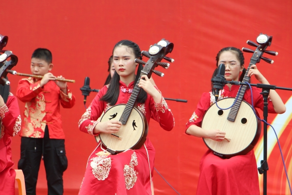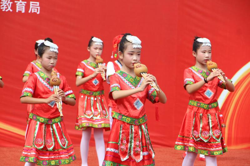 活動現場,上杭縣蛟洋中心小學操場上人頭攢動,熱鬧非凡。展演活動在美妙動聽的葫蘆絲樂曲中拉開序幕,《剪紙時裝秀》、十番音樂《錦上添花》《畫眉跳架》、樹葉吹奏《十送紅軍》、舞蹈《我們的田野》、紅色木偶劇《山雀兒》、舞蹈《小戲骨》、葫蘆絲演奏《映山紅》《月光下的鳳尾竹》等精彩表演輪番上演,既有民樂的溫婉柔美,又有剪紙、木偶戲等非遺文化的悠悠古韻,充分展示了上杭縣鄉村學校少年宮建設成果。