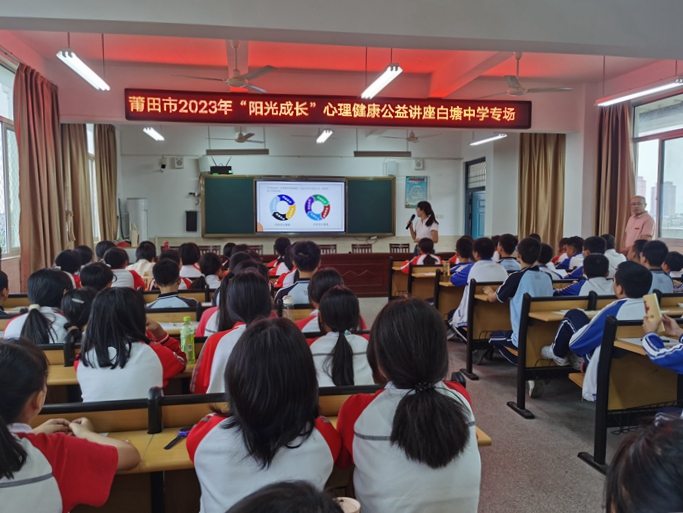 為認真學習貫徹習近平新時代中國特色社會主義思想,確保第二批主題教育高質量落實,莆田市委文明辦結合主題教育總要求,充分發揮校外未成年人心理健康輔導站的作用,組織開展未成年人心理健康公益系列講座,進一步培養未成年人健全的人格和良好的個性心理品質,推進莆田市未成年人心理健康教育工作。近日,由莆田市委文明辦、莆田市教育局主辦的莆田市2023年“陽光成長”心理健康公益講座在白塘中學舉行。涵江區校外未成年人心理健康輔導站咨詢師顏瑪莉開展“激活身心正能量 做更好的自我”心理輔導講座。