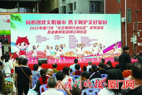 文藝匯演傳新風、有獎問答掀熱潮、文明集市聚人氣……日前,2023年廈門市“與文明同行”系列活動在同安區的首站活動來到美林街道四口圳社區,活動現場熱鬧非凡,不僅有精彩紛呈的演出,還有文明知識互動問答,豐富多樣的志愿服務,吸引了眾多居民駐足參與。