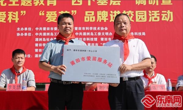 活動伊始,伴隨著熱火朝天的腰鼓表演,出席領導為湄洲第一中心小學頒發“莆田市愛苗服務站”第036號牌匾,并為六位榮獲“校園科技小達人”的學生頒發獎狀。莆田市科協向湄洲第一中心小學捐贈科普書籍,以激勵孩子們的科學志向,傳遞科學精神。