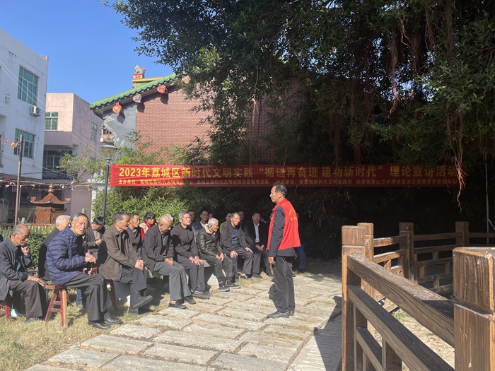 文明風11月21日訊 11月17日上午,由荔城區新時代文明實踐中心主辦、新度鎮新時代文明實踐所協辦的新時代文明實踐“循跡再奮進 建功新時代”理論宣講活動在蒲坂村榕樹公園拉開序幕。本次宣講活動旨在深化學習貫徹習近平新時代中國特色社會主義思想主題教育,推動落實省文明委提出的“循跡再奮進”新時代文明實踐提質培優工程,推動新思想深入人心、落地生根,激發城鄉精神文明建設內生動力和發展活力。