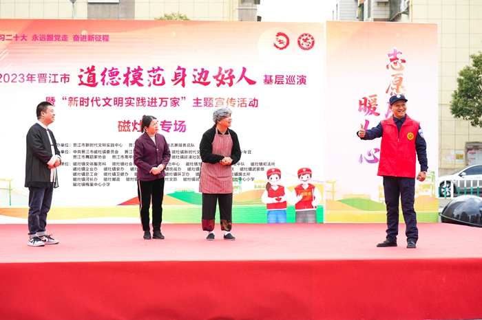 文明風12月28日訊 12月27日下午,晉江市2023年度道德模范身邊好人基層巡演暨“新時代文明實踐進萬家”主題宣傳活動在晉江市磁灶鎮延澤社區新時代文明實踐法治廣場舉辦。