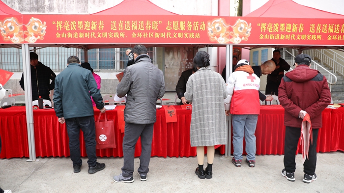 除了精彩的文藝表演,主辦單位還在現(xiàn)場設置了志愿服務集市。有寫春聯(lián)送春聯(lián)、垃圾分類宣傳、安全燃煙火宣傳、應急救護知識普及、愛心義剪、口腔健康義診等志愿服務。一幅幅蘊含著美好祝福和濃濃年味的春聯(lián)一氣呵成,喜慶的話語充滿了濃濃的年味,貼心服務不僅暖人心更合群眾的“口味”。