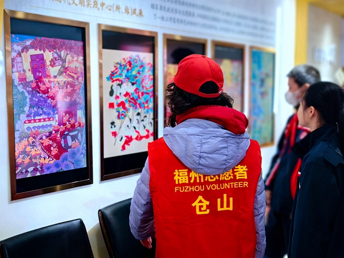 志愿者在倉山區新時代文明實踐中心與群眾一同賞年畫(倉山區委文明辦 供圖)