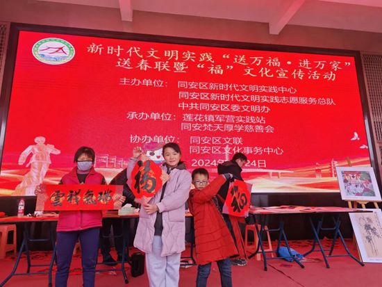 文明風2月18日訊 春節期間,在同安區新時代文明實踐中心、同安區新時代文明實踐志愿服務總隊指導下,由中共同安區委文明辦主辦,同安梵天厚學慈善會承辦,同安區文聯、同安區文化事務中心協辦的“送萬?!みM萬家”活動和“賞年畫·過大年”活動走進了同安區多個村居,開展送春聯、觀年畫等文明實踐活動,并與春節期間送溫暖活動緊密結合,營造了群眾高高興興過大年的濃厚節日氛圍。