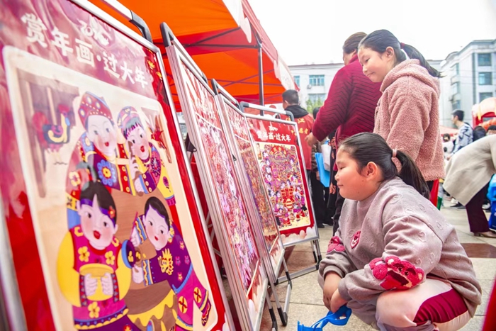“爸爸,你看這些五顏六色的年畫真好看!”“我想要那個(gè)福字”“快一點(diǎn),這里還有故事聽”……在城關(guān)一綜合城市廣場(chǎng)內(nèi),稚嫩又歡快的聲音此起彼伏。現(xiàn)場(chǎng)擺放的一張張色彩鮮艷、風(fēng)格獨(dú)特的年畫為春節(jié)增添了濃濃的年味,吸引了不少居民和小朋友觀賞。