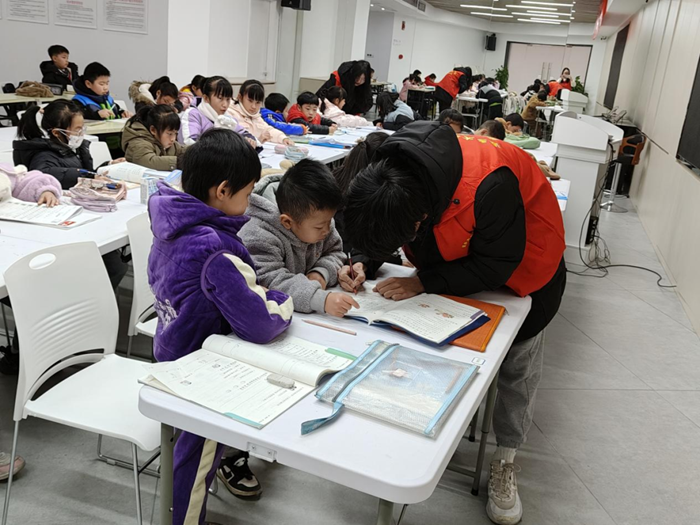 玉屏街道步行街社區大學生志愿者為轄區孩子免費輔導寒假作業。 玉屏街道步行街社區供圖