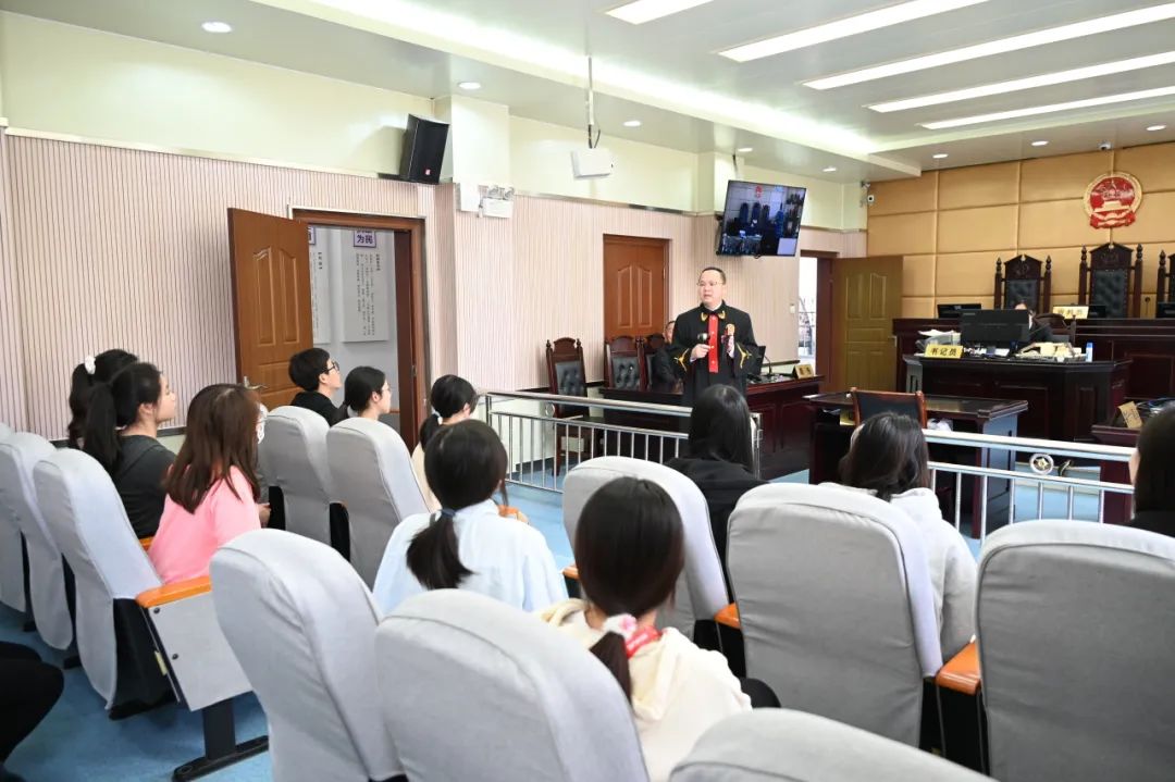 圖為古田法庭結合法庭開放日、紅色走讀活動,向來庭交流的青年大學生講述共和國法治起源、普及婚姻法沿革知識