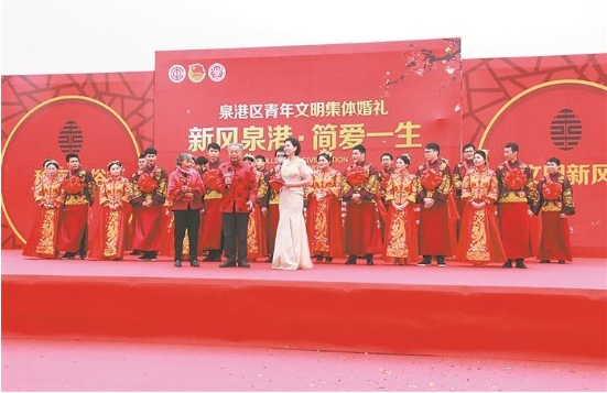 牽紅綢、跨火盆、行拜堂禮、鎖同心鎖、讀婚書儀……5月20日,泉港區青年職工集體婚禮活動在泉港區錦繡廣場舉行,35對新人、5對金婚伉儷身著中式禮服走過幸福門,一起迎接幸福生活。集體婚禮上,金婚代表分享持家之道,引導青年樹立正確的家庭觀和婚姻觀,倡導簡約節儉、文明健康的婚戀新風尚。