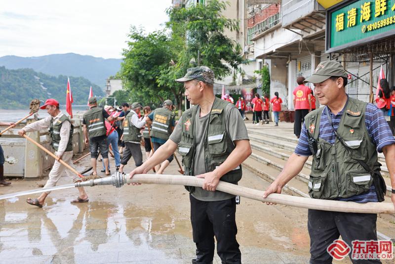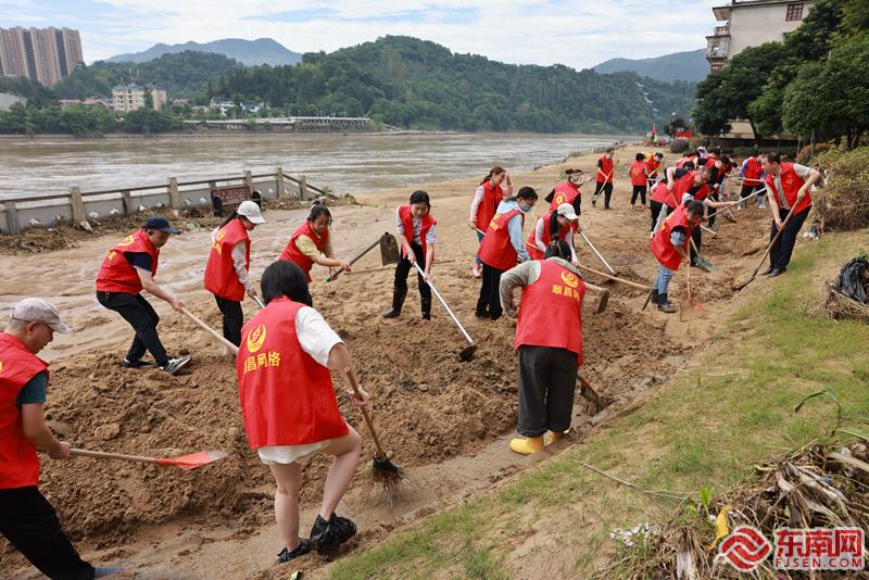 6月20日上午,順昌縣城關富屯溪沿江漫道上,順昌縣新時代文明實踐中心志愿服務隊和社會志愿服務隊員們,正在忙碌著。一抹抹紅色,同腳下的淤泥,溪上退去的洪水形成鮮明的對比,分外鮮艷。