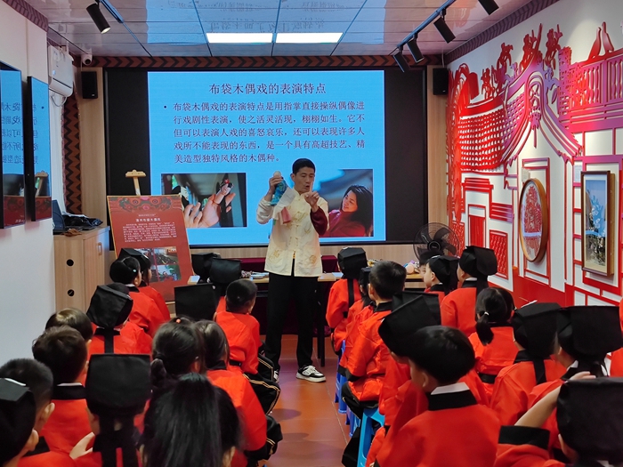 “布袋木偶戲非遺小課堂”老師授課(西橋街道 供圖)