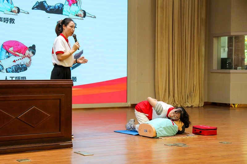 南平市紅十字會(huì)應(yīng)急救護(hù)培訓(xùn)師資的兩位授課老師為賽事志愿者演示常見急癥急救的處置方法。何丹燁 攝